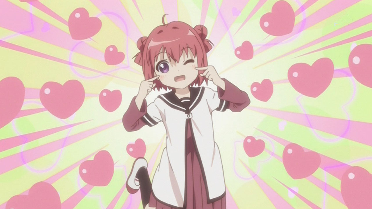 Description: A girl in a school uniform standing in front of hearts with her hands on her ears and a cat on her shoulder.