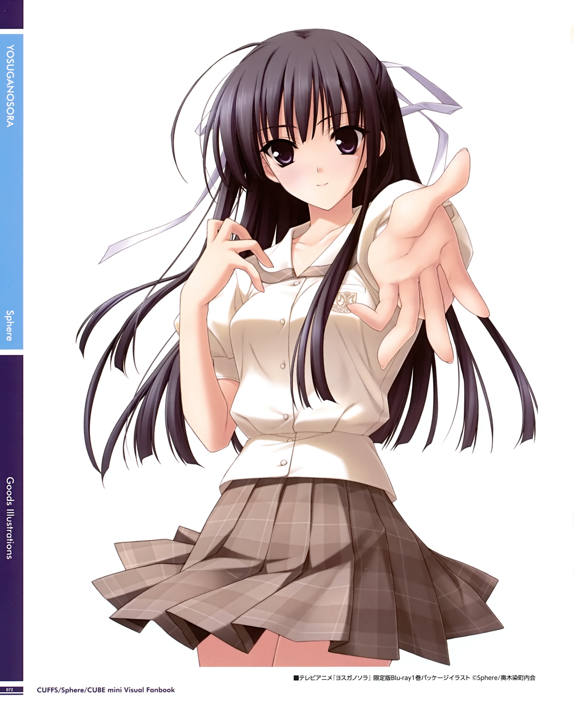 Description: A girl in a school uniform holding a white object in her hand and pointing at the camera with a smile.