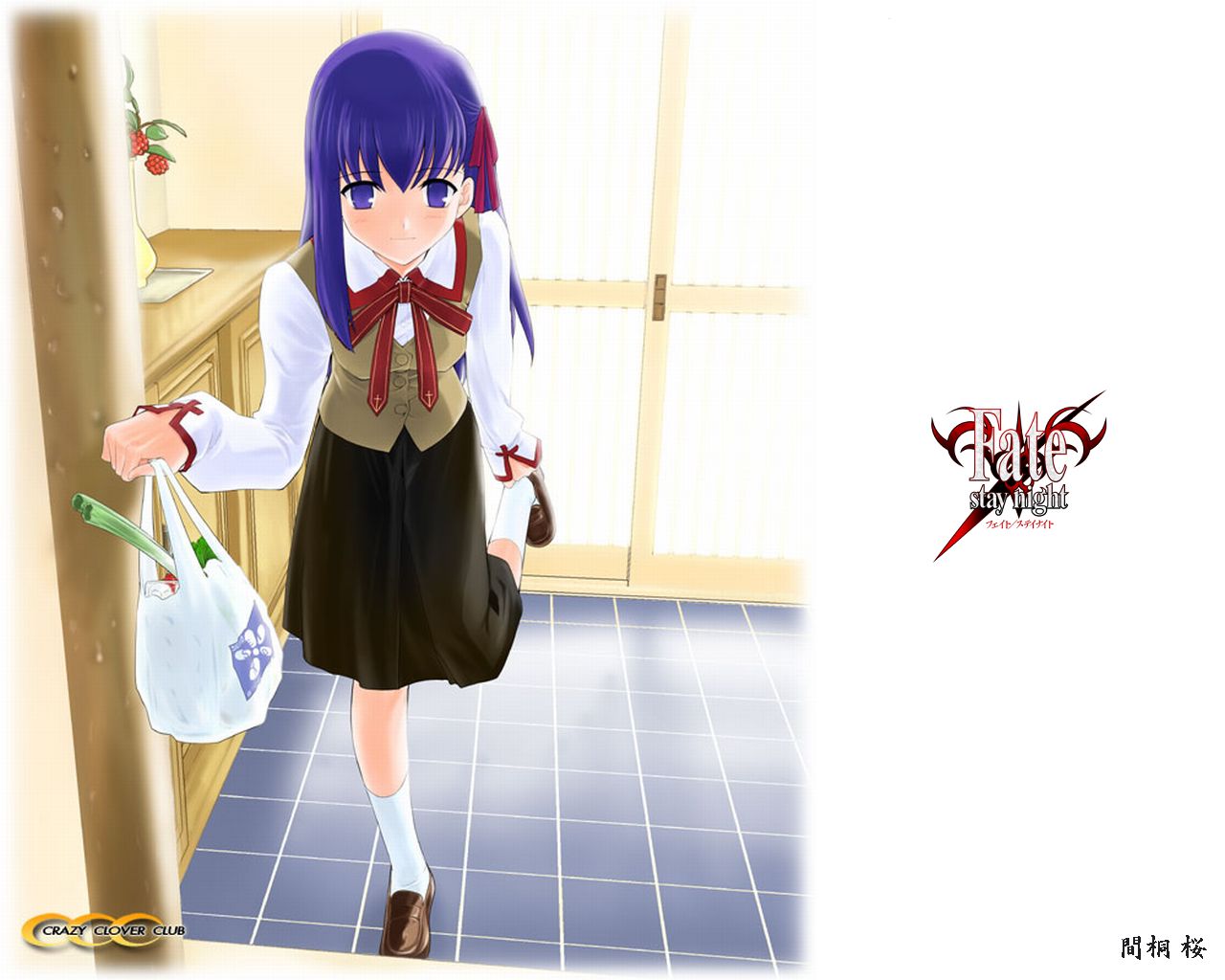 Description: A girl in a school uniform holding a bag and a bag of food in her hand and a red ribbon around her neck.