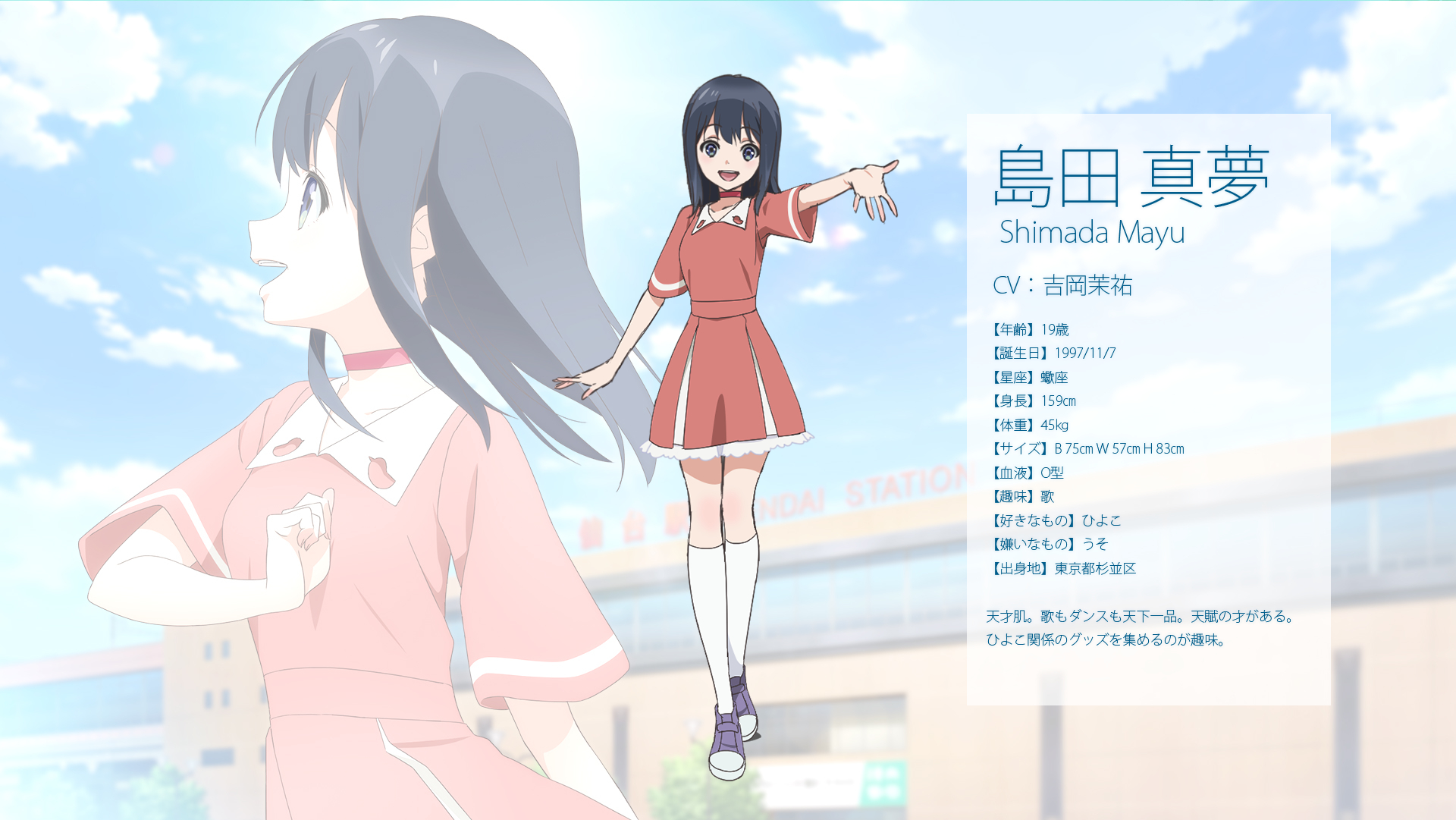 Description: A girl in a short dress is standing in front of a building with a sign that says shinna miya.