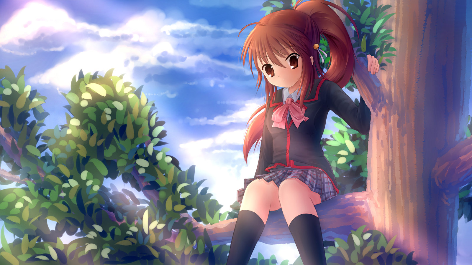 Description: A girl in a short skirt and boots sitting on a tree branch in a forest with clouds in the background.