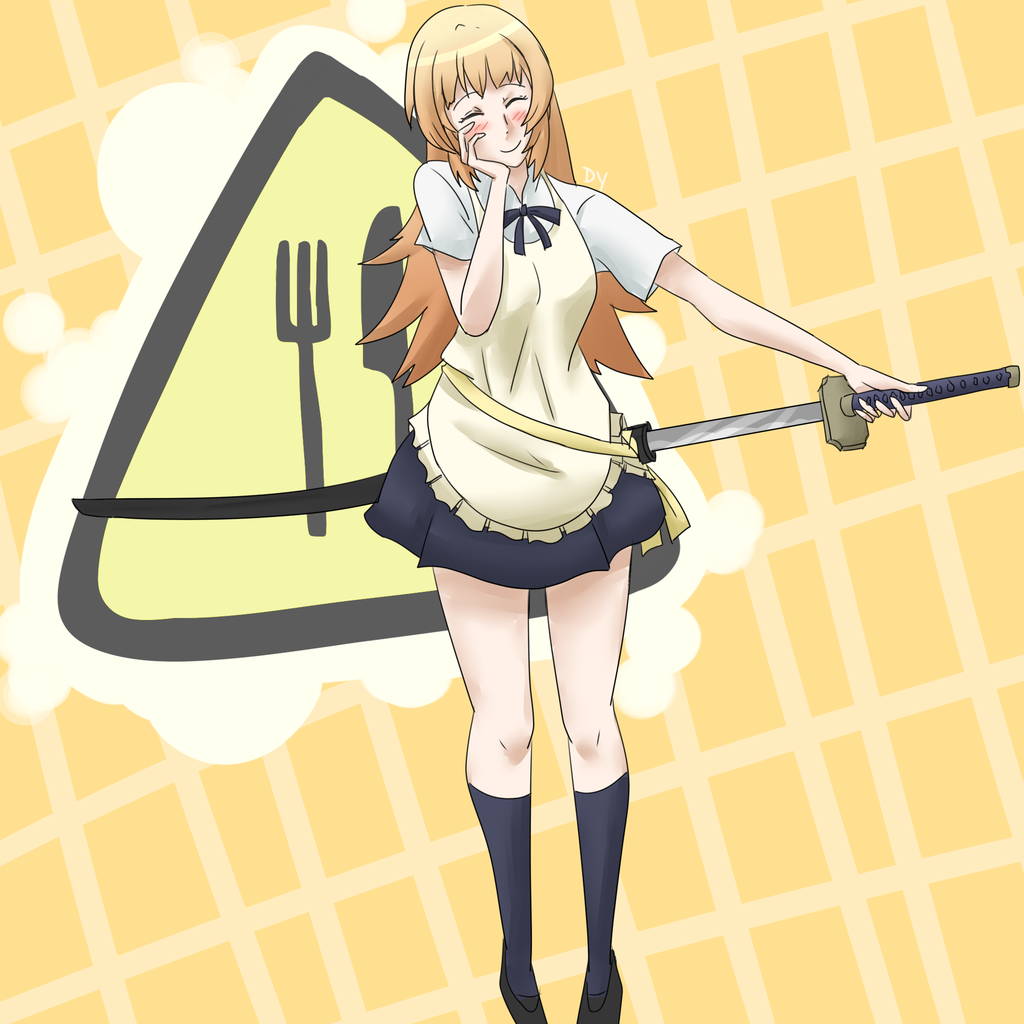 Description: A girl in a short skirt holding a fork and knife in her hand and a sign behind her that says caution.