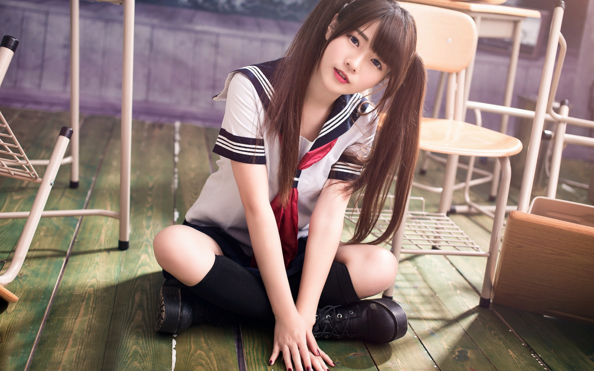 Description: A girl sitting on the floor with her legs crossed and her hand on her knees.