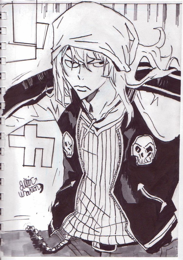 Description: A drawing of a girl with a skull on her arm and a hat on her head.