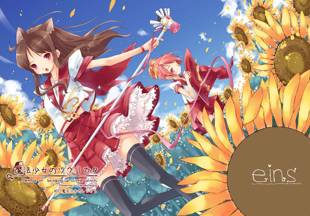 Description: A girl in a red dress is standing in a field of sunflowers with a sword in her hand.