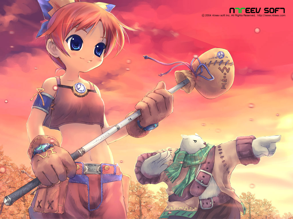 Description: A girl holding a sword and a dog in front of a sunset sky with clouds and trees in the background.