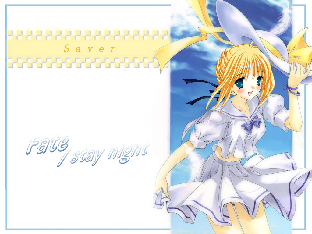 Description: A girl in a dress holding a sword and a white frame with a yellow ribbon around her neck and a blue sky behind her.