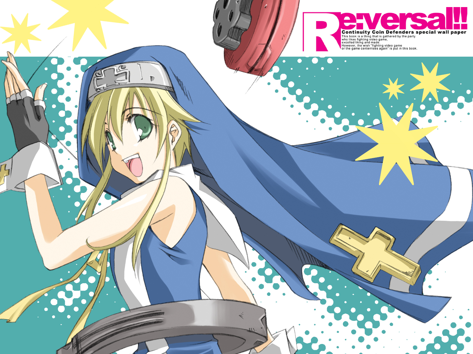Description: A girl with a sword and a hat on her head and a blue cape over her head and a cross on her shoulder.