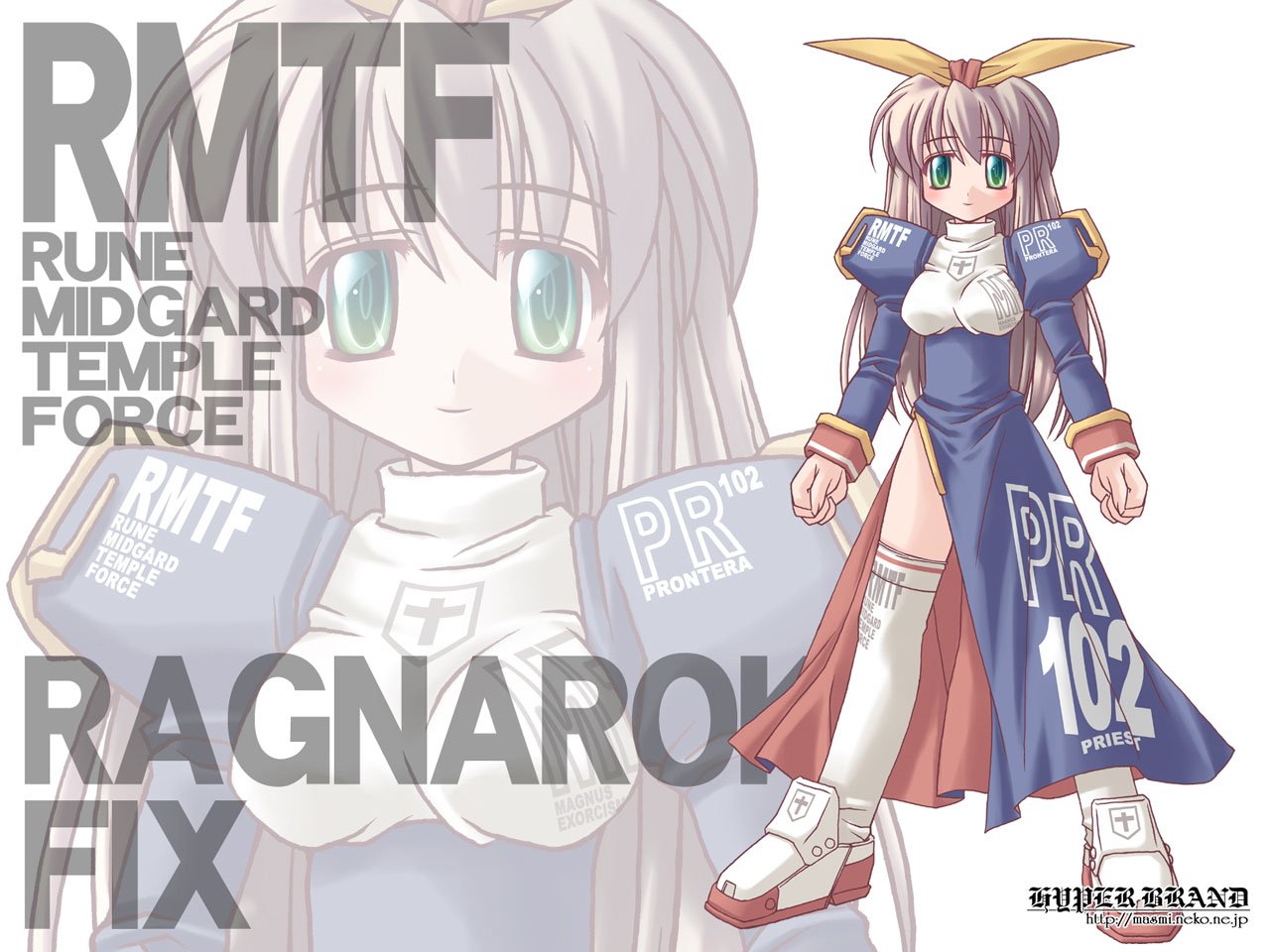 Description: A girl in a dress with a sword and a name tag on it that says rmtf rune mid - temple force ragaro fix.