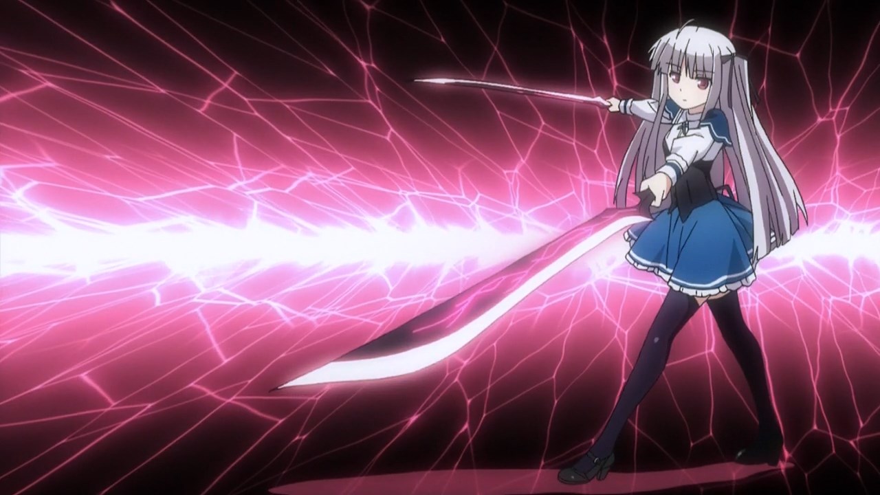 Description: A girl with a sword in a pink background with lightning streaks around her and a pink lightening behind her.