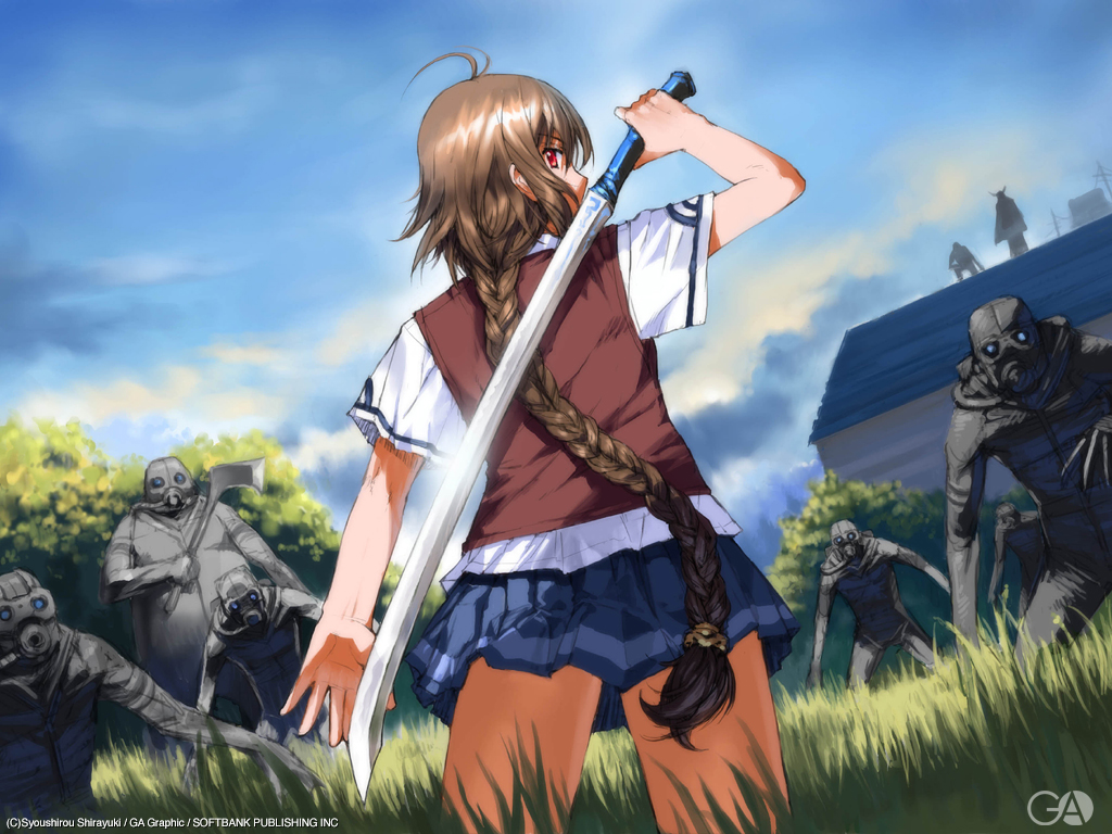 Description: A girl with a sword standing in a field of zombies behind her.