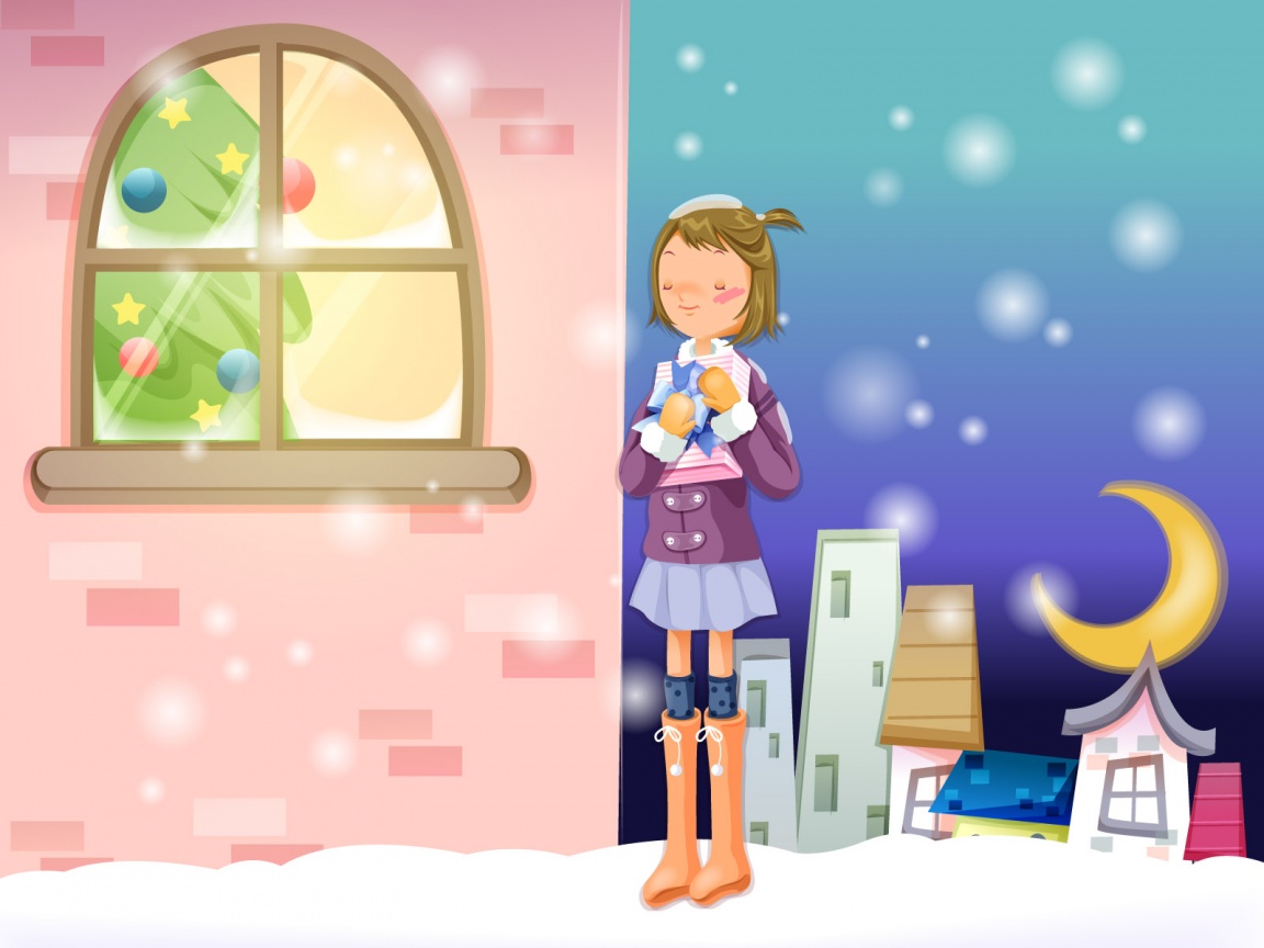 Description: A girl holding a teddy bear in front of a window with a snowy background and a moon in the sky.