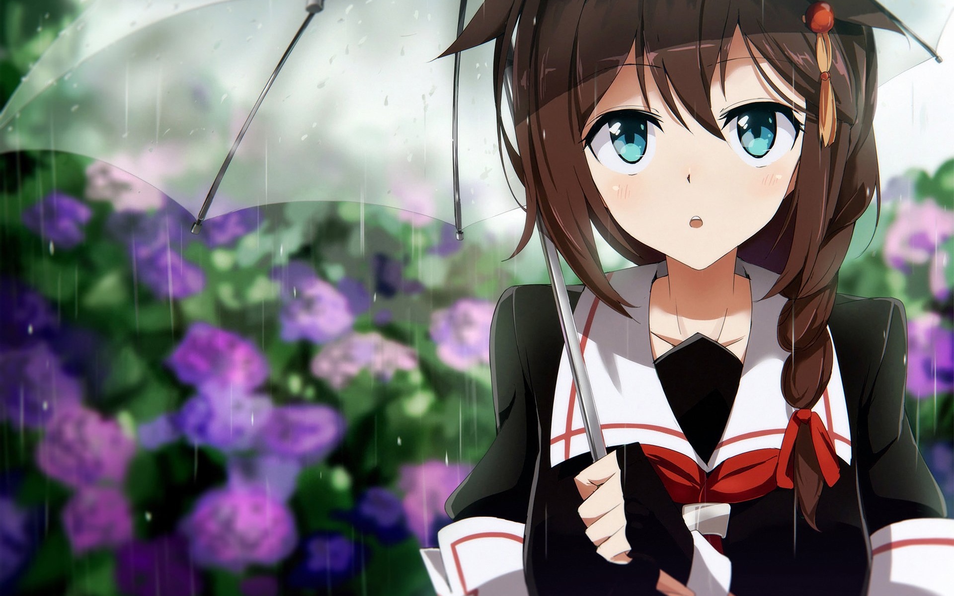 Description: A girl with an umbrella standing in a field of flowers in the rain with purple flowers behind her and a purple flower behind her.