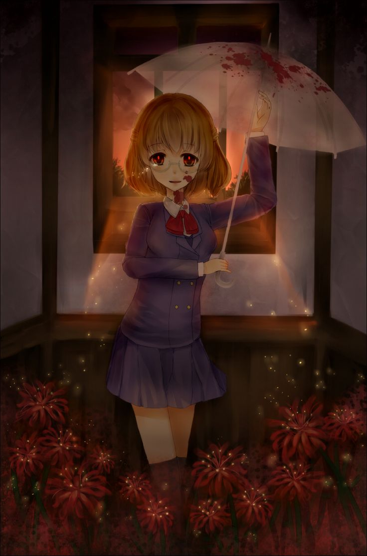 Description: A girl holding an umbrella in a room with flowers and a window behind her is a red light shining.