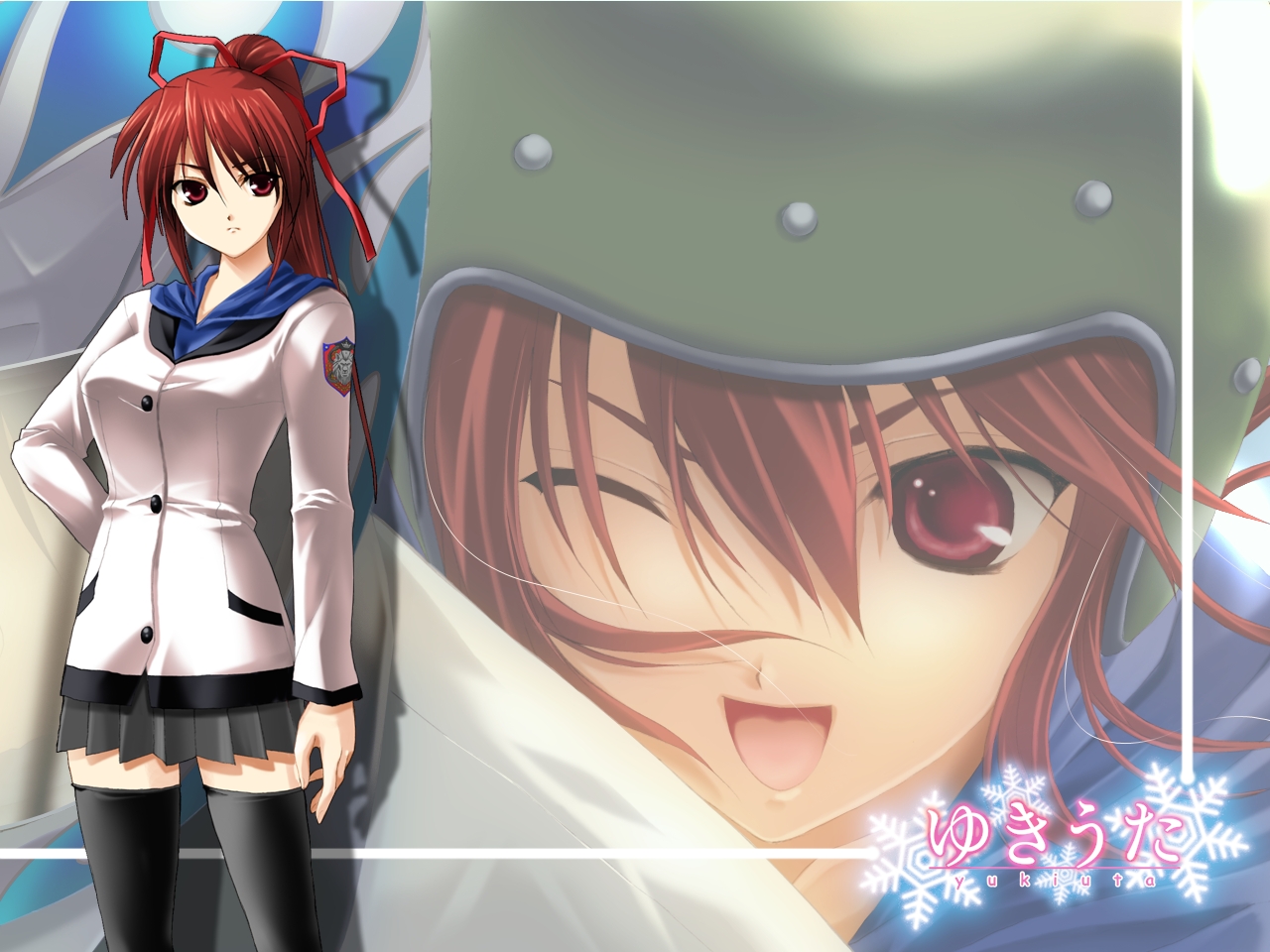 Description: A girl in a uniform is standing next to a wall with a picture of a girl in a helmet.