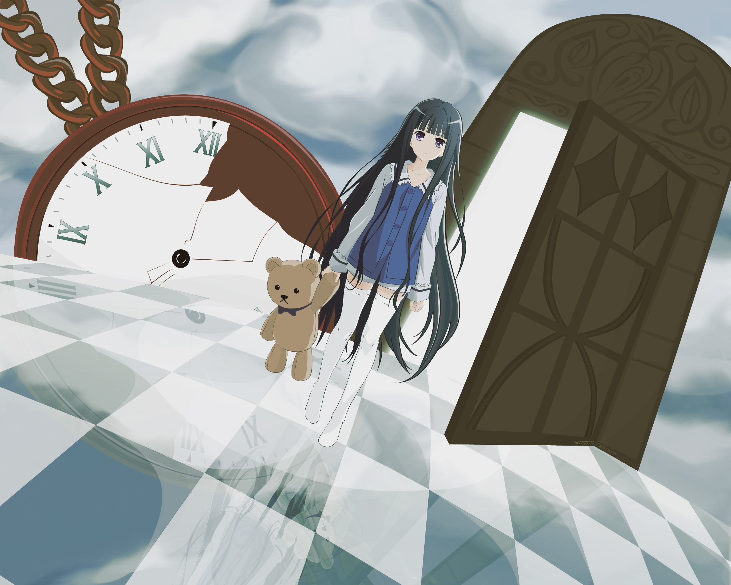 Description: A girl is walking in front of a clock and a teddy bear in a cartoon style scene with a clock.