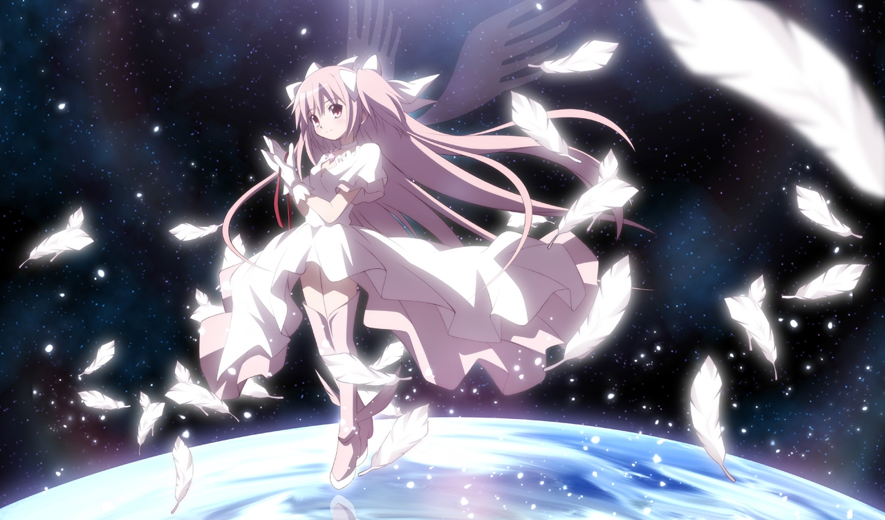 Description: A girl in a white dress flying over a planet with birds flying around her and a sky full of stars.