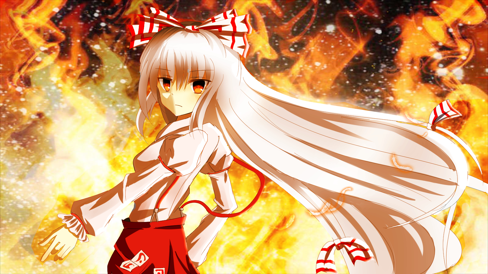 Description: A girl with long white hair and a bow in her hair standing in front of a fire with candy canes.