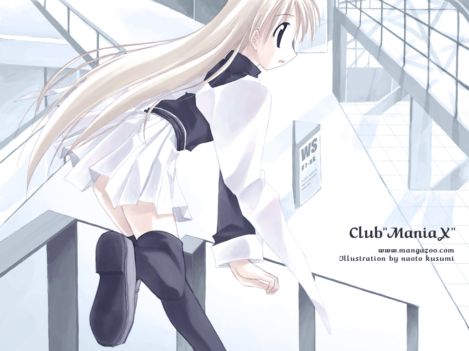 Description: A girl in a white shirt and black pants is standing on a set of stairs and looking down at the ground.