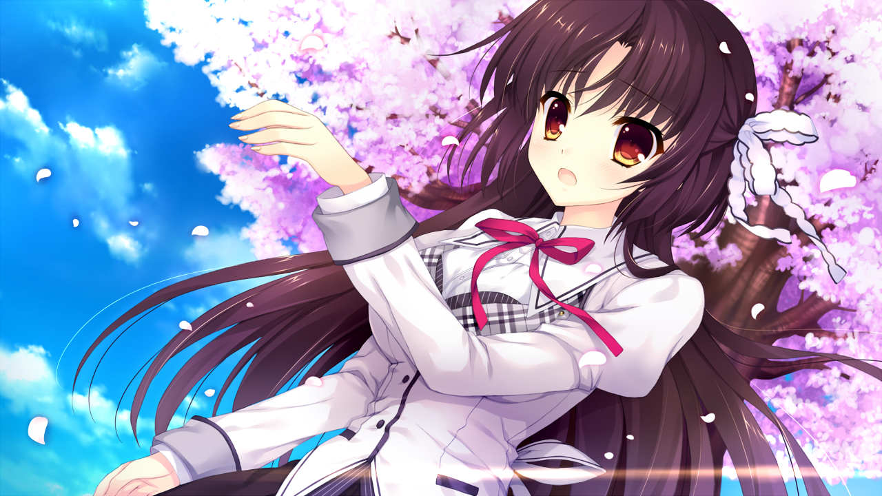 Description: A girl in a white shirt and a pink flower in her hair and a blue sky with clouds and pink flowers.