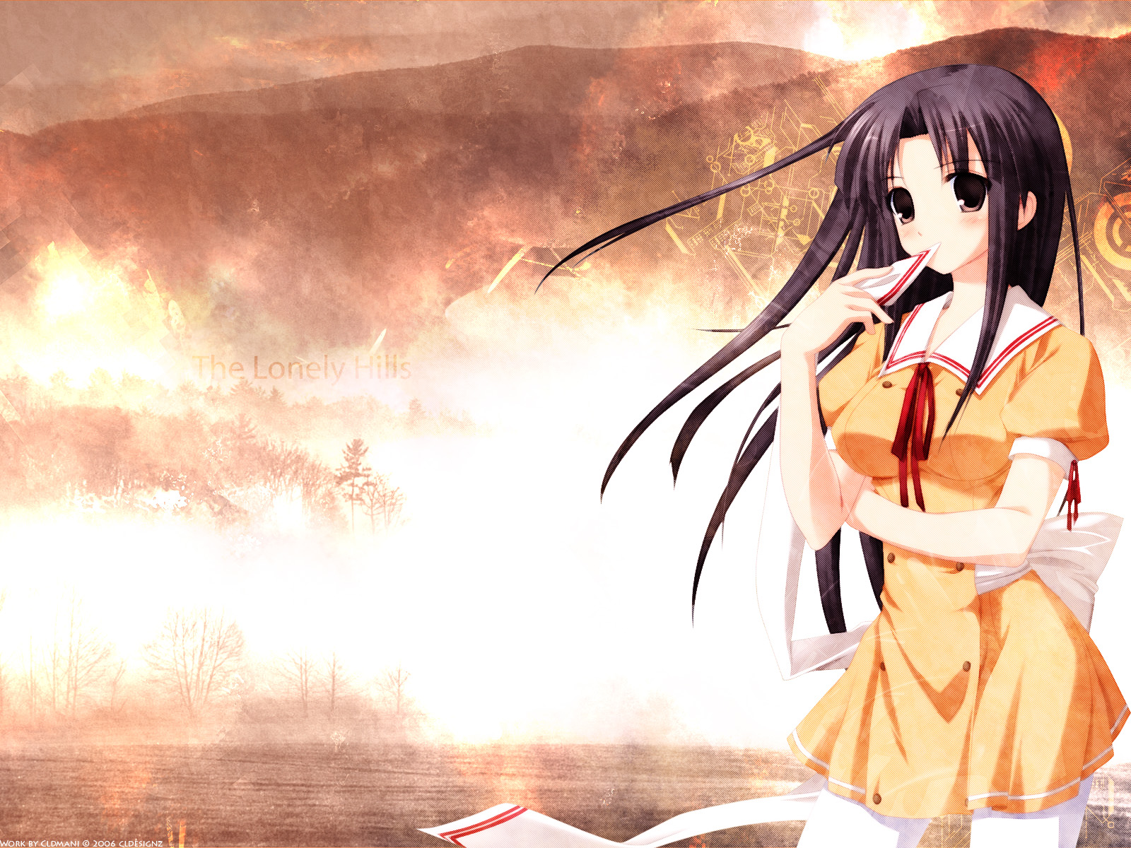 Description: A girl in a yellow dress is holding a book and a red ribbon in her hand and a mountain in the background.