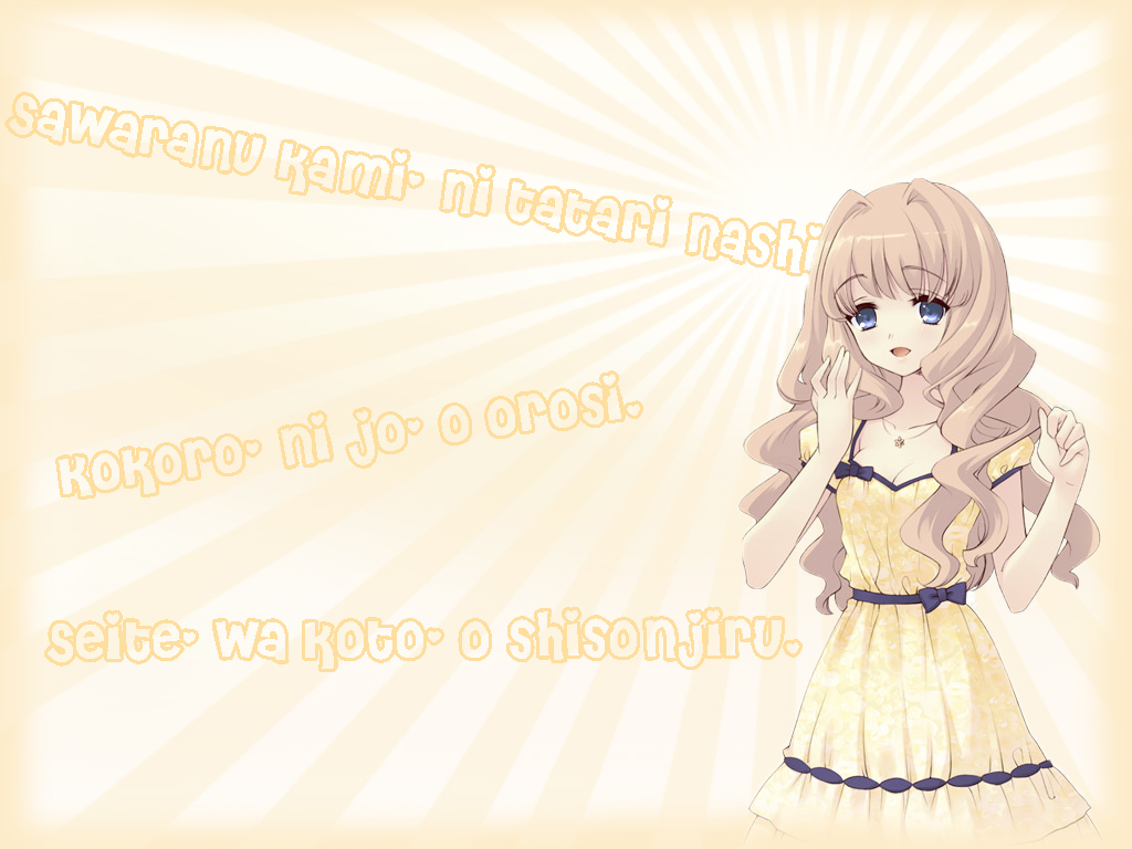Description: A girl in a yellow dress with a white background and a quote from the anime girl in the background.