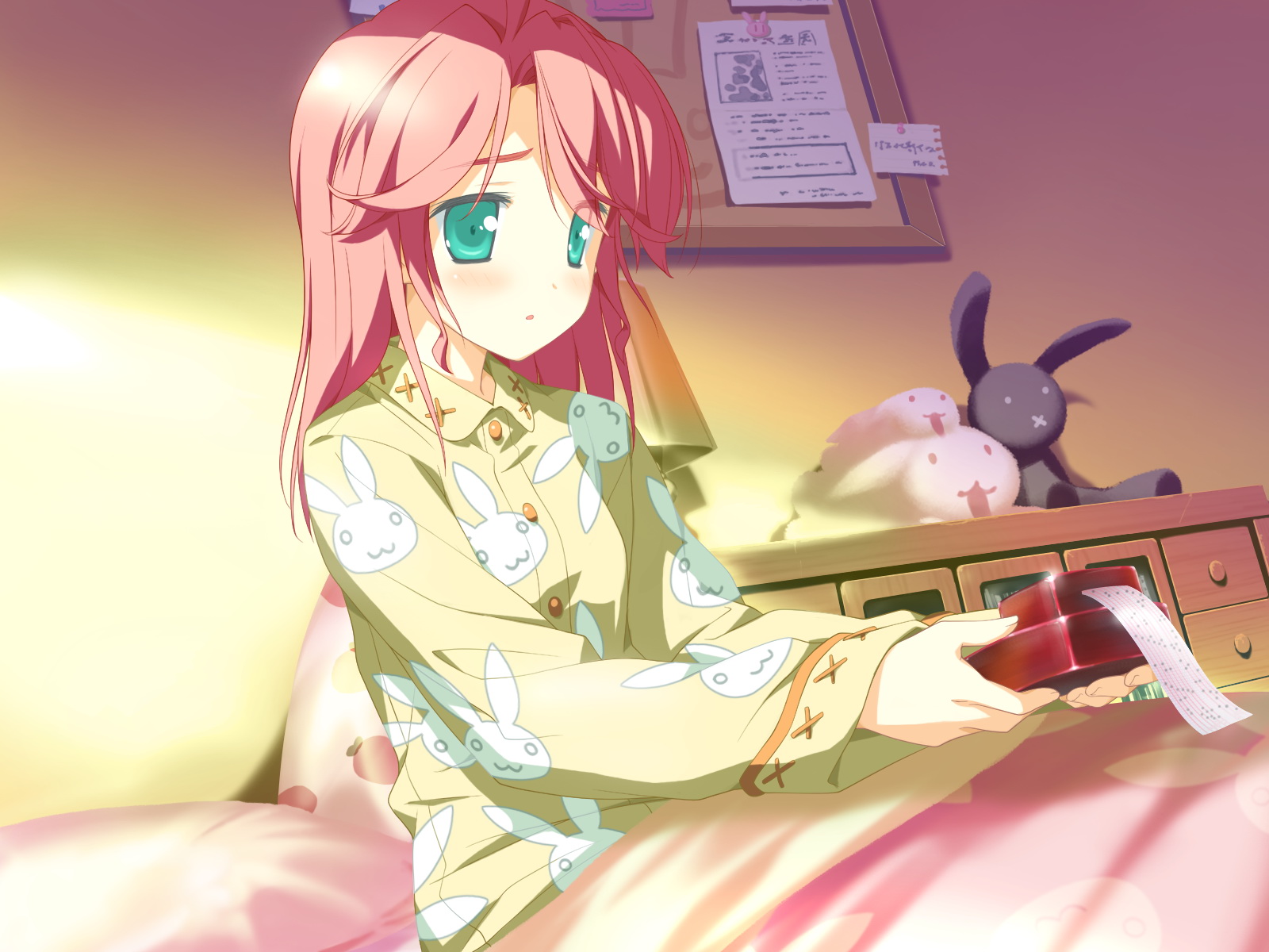 Description: A girl in a yellow shirt is sitting on a bed with a pink hair and green eyes and a pink hair.