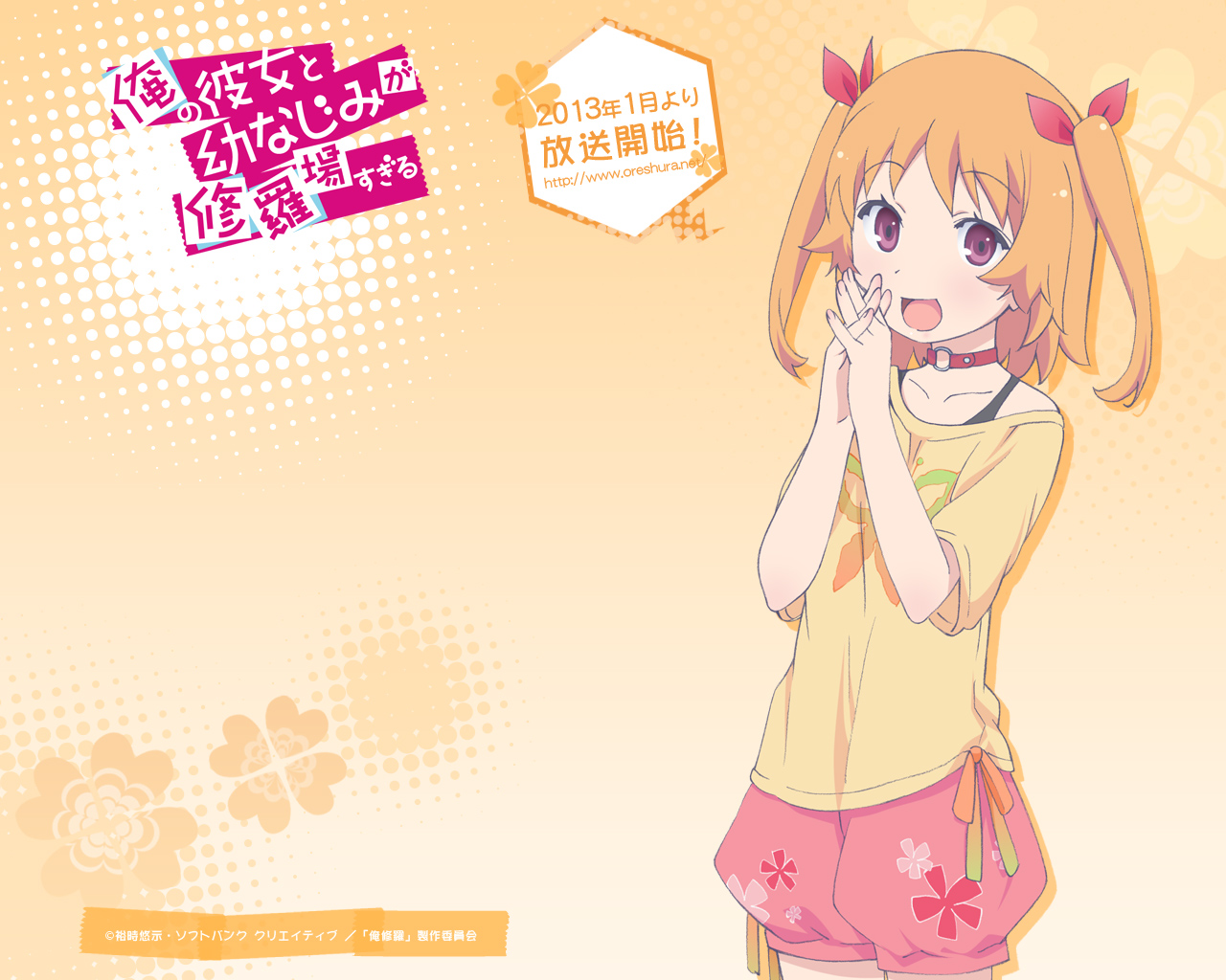 Description: A girl in a yellow shirt and pink shorts is talking on a cell phone with a yellow background and a pink and white background.