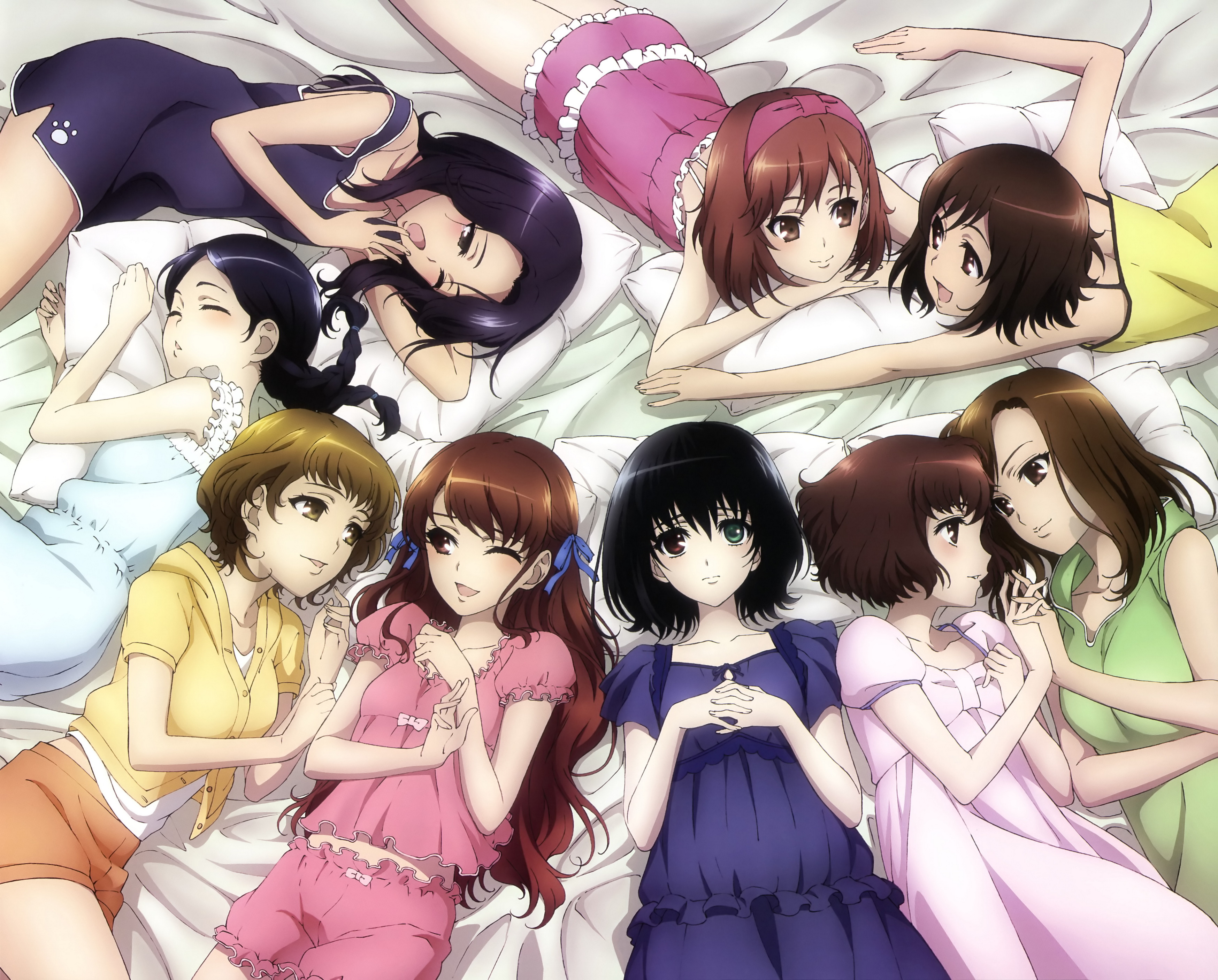 Description: A group of girls laying in bed together with their arms around each other and their backs turned to the side.