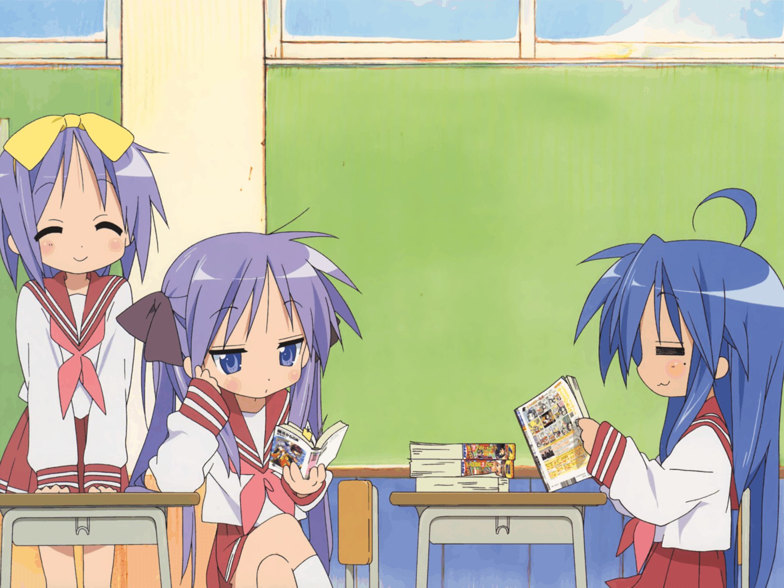 Description: A group of girls sitting at a table with books in front of them and a green wall behind them.