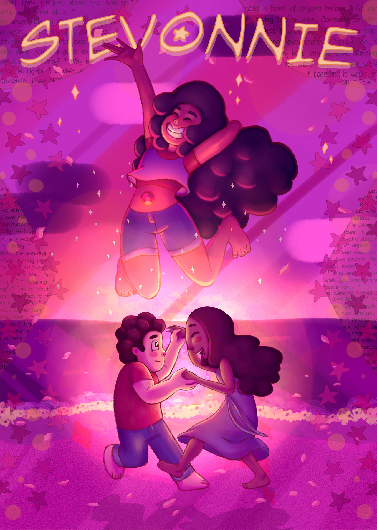 Description: A poster with two girls dancing together in the air with stars around them and the words stevonne above them.