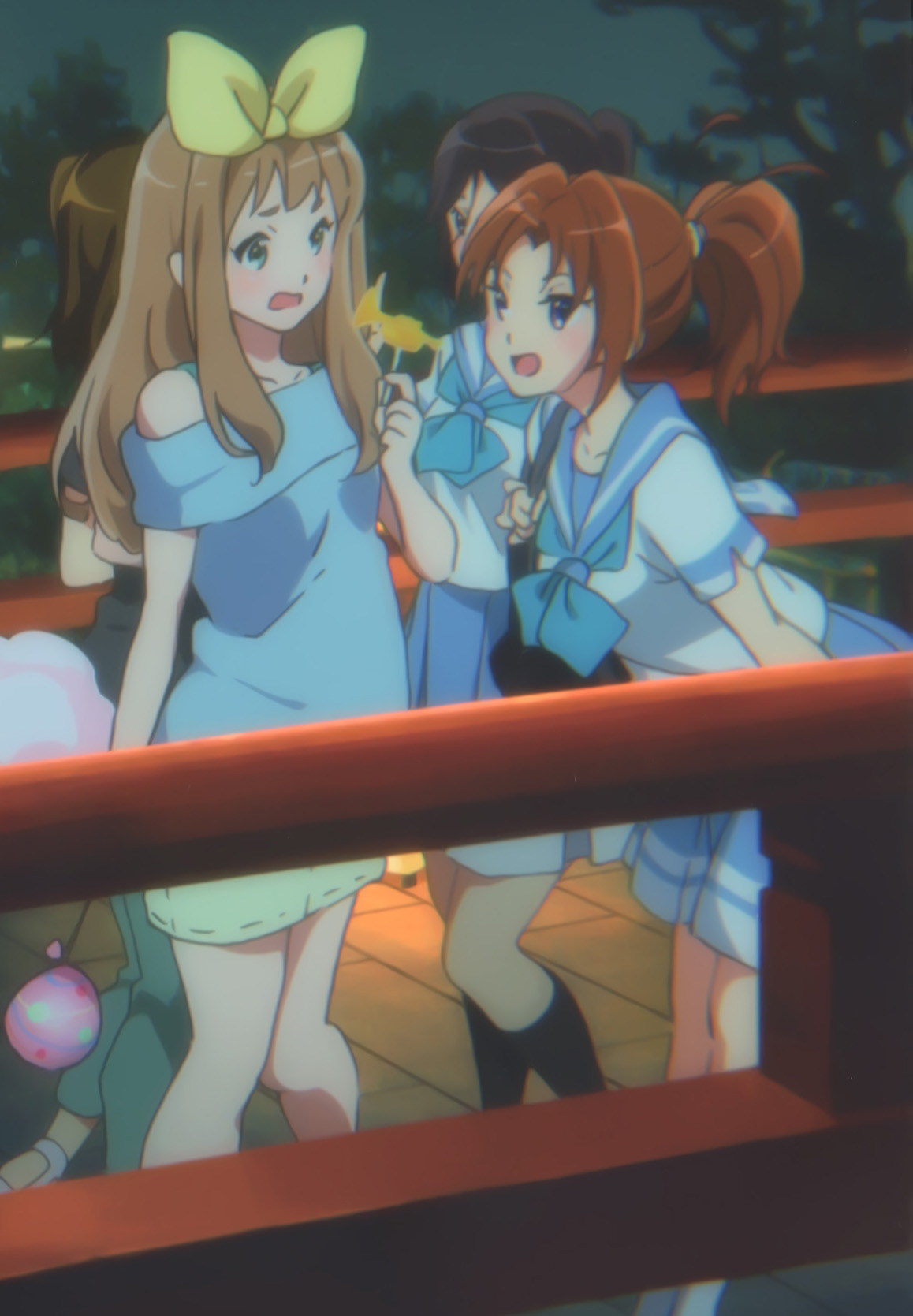 Description: Two girls standing on a deck with a flower in their hand and a man standing behind them with a gun in his hand.