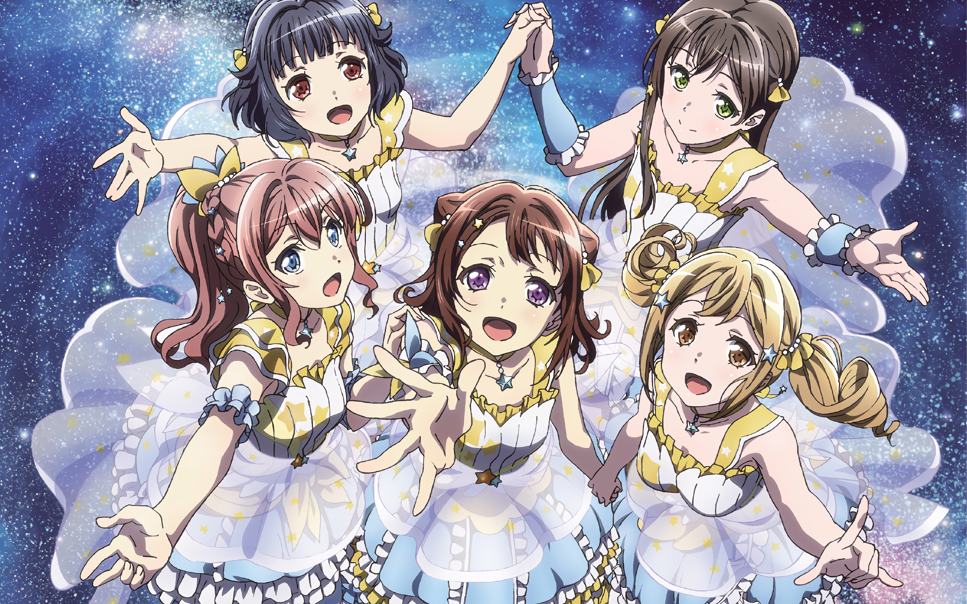 Description: A group of girls in dresses standing in front of a blue sky with stars and clouds behind them.