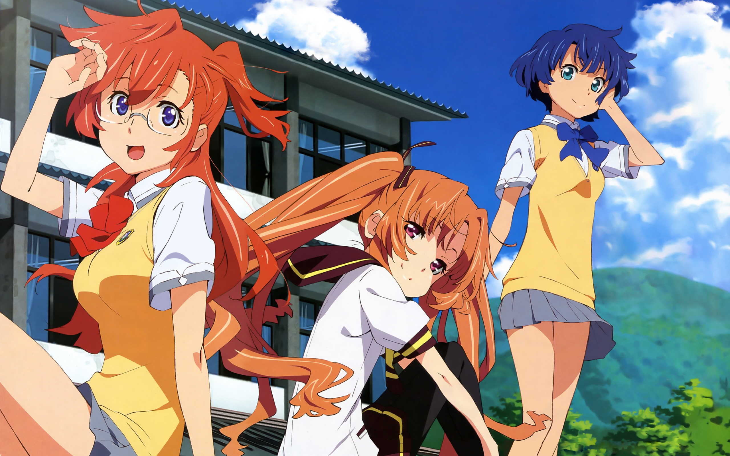 Description: A group of girls standing next to each other in front of a building with a sky background and clouds.