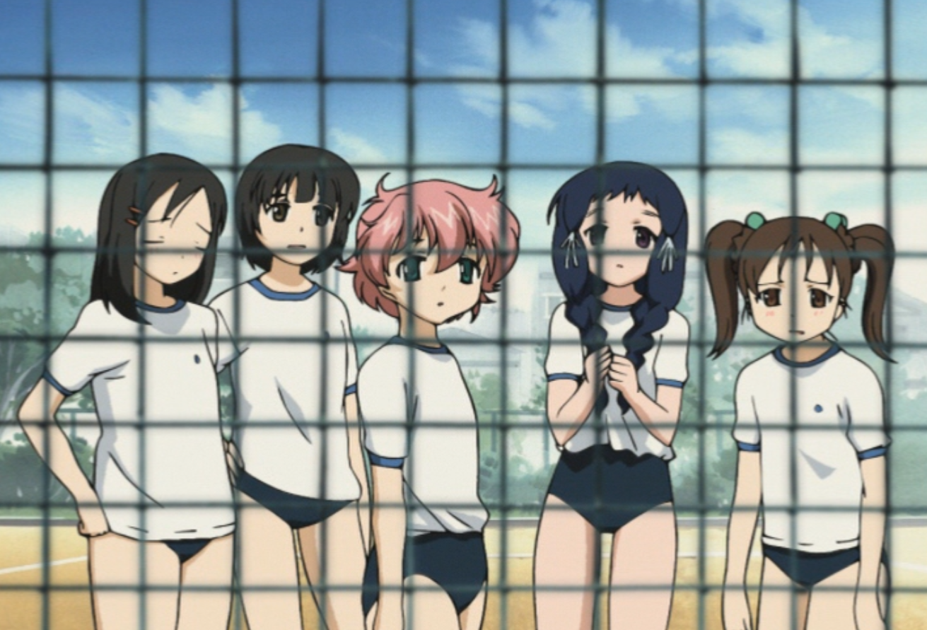 Description: A group of girls standing next to each other in front of a fence with their hands together in front of them.