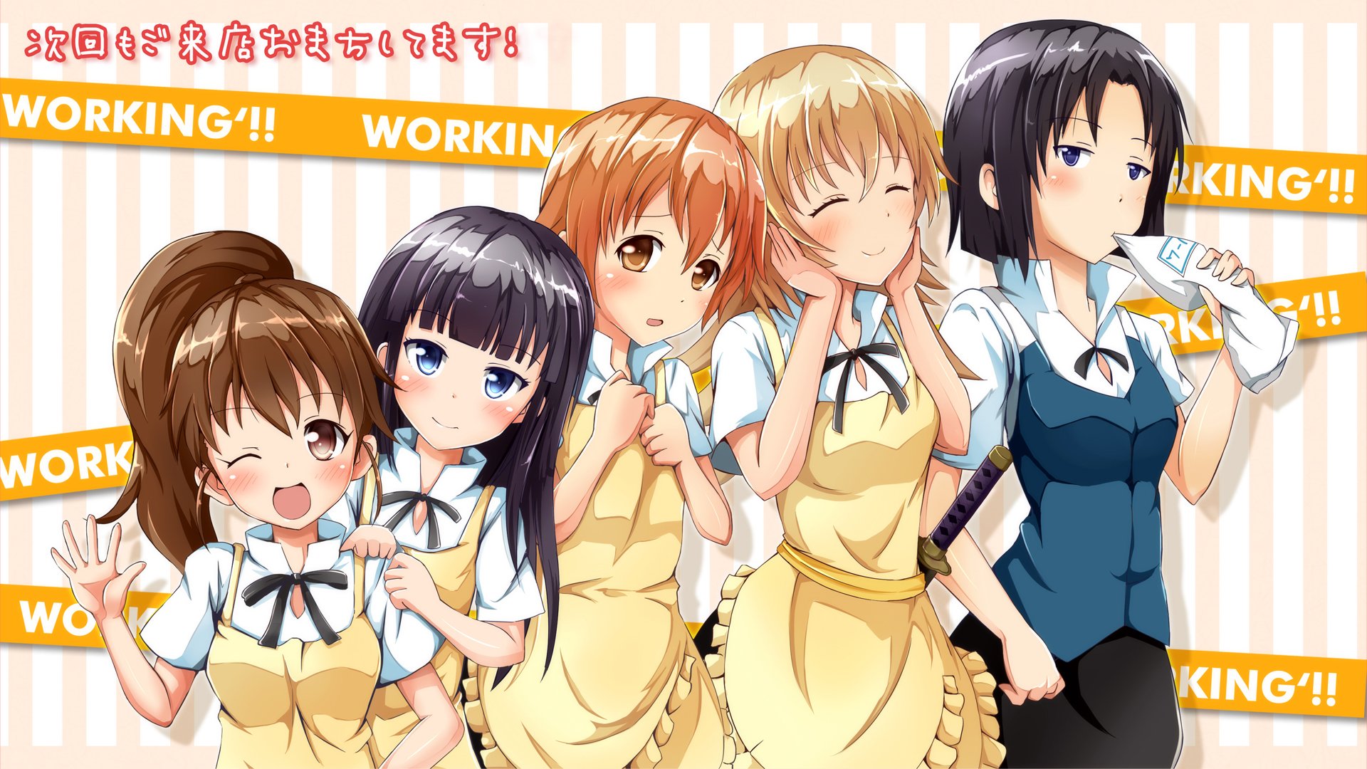 Description: A group of girls standing next to each other in front of a sign that says working working working working.