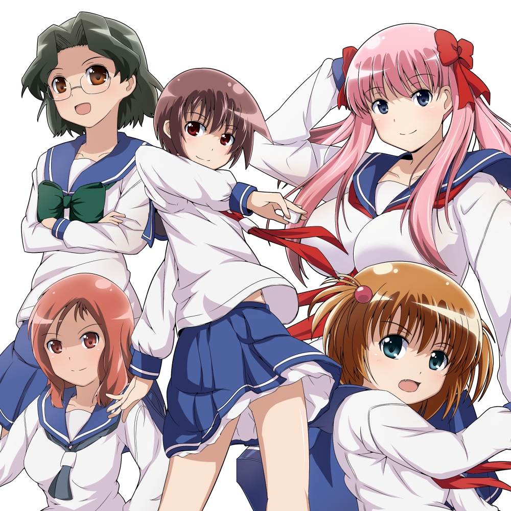 Description: A group of girls in school uniforms posing for a picture together with their arms around each other and their backs to the side.