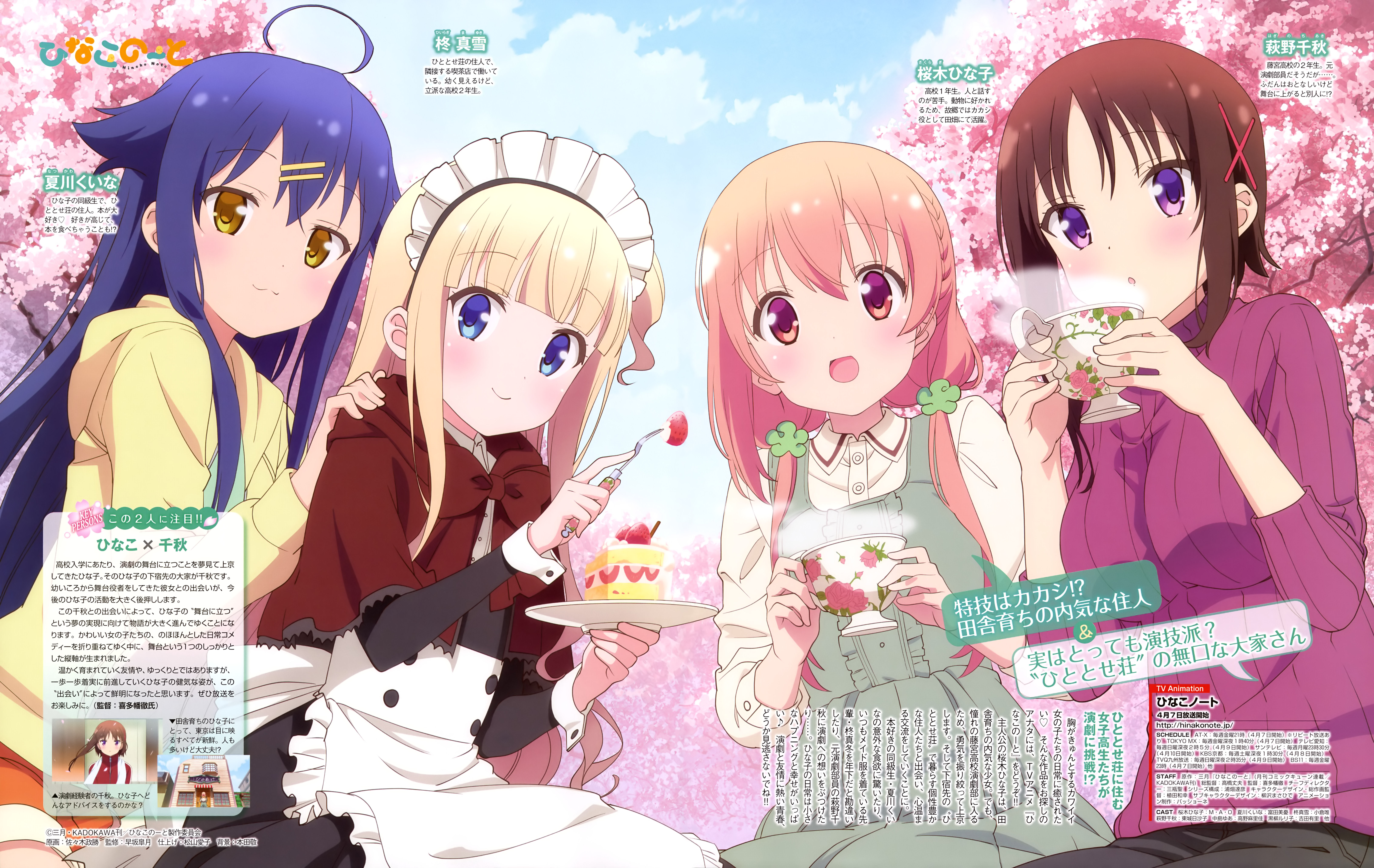 Description: A group of girls sitting next to each other in front of a tree with pink flowers and a sign.