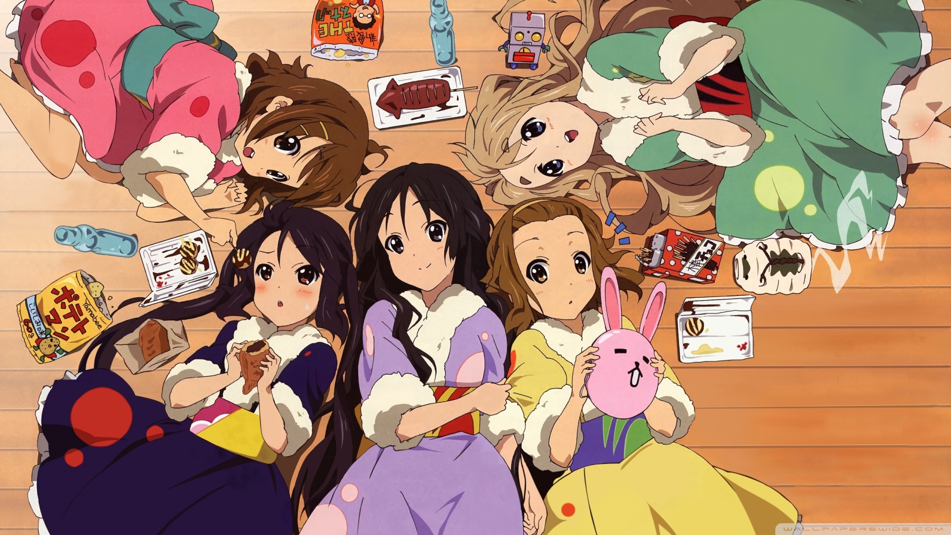 Description: A group of girls sitting on top of a wooden floor next to each other with food on them and a stuffed animal.