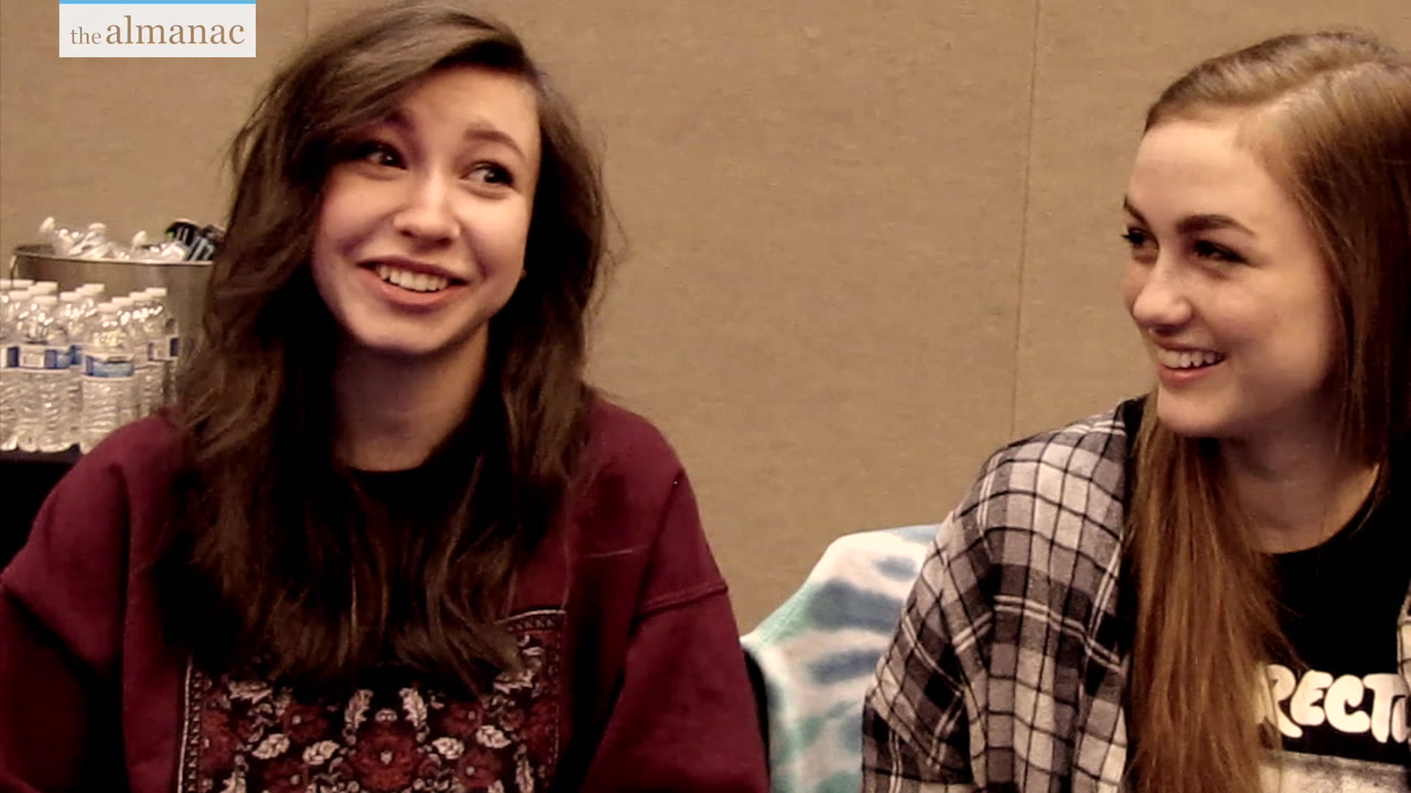 Description: Two girls sitting next to each other smiling at the camera while holding a remote control in their hand and looking at the camera.