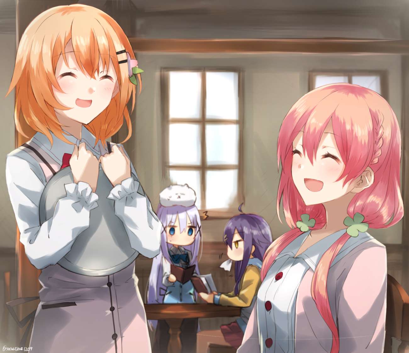 Description: Two girls standing next to each other in a room with windows and a table with a cup on it.