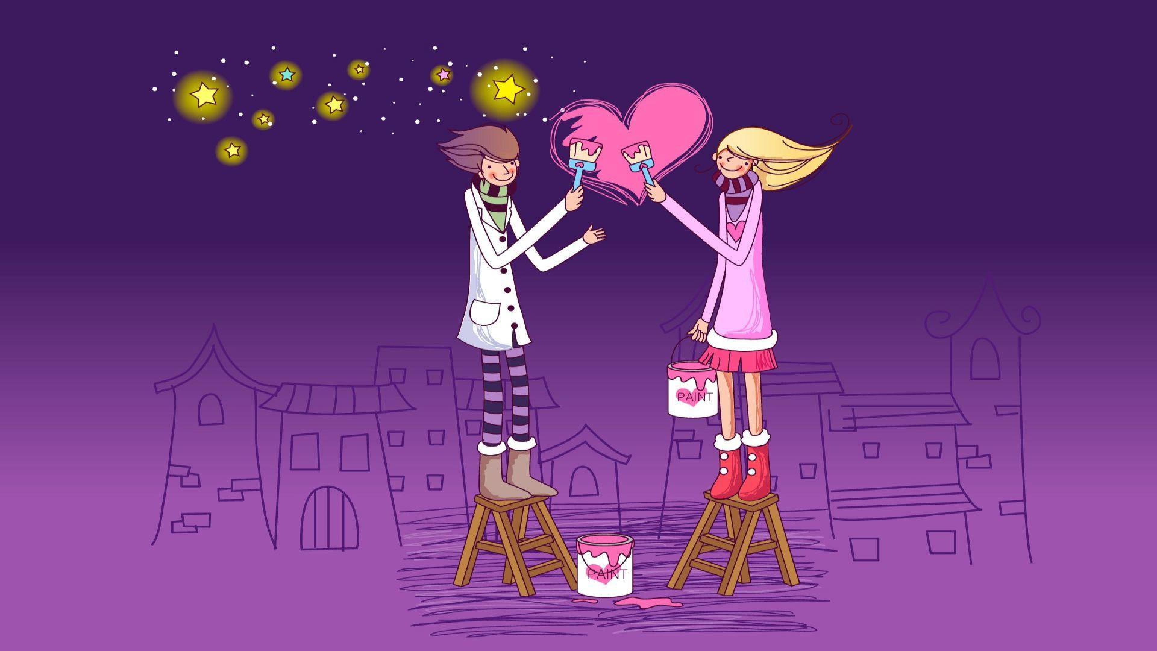 Description: A couple of girls standing on top of stools in front of a city skyline with stars and a pink hair.