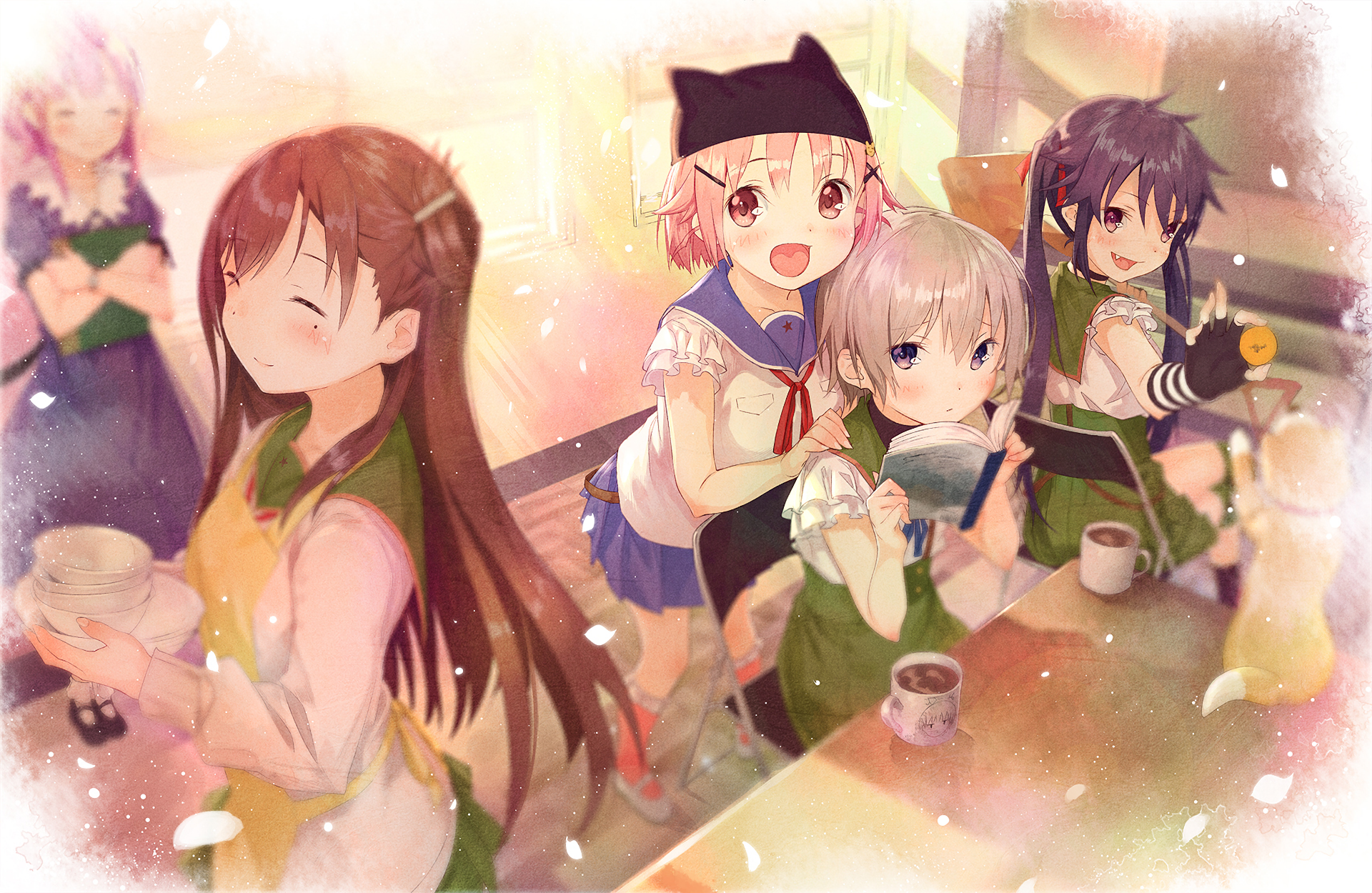 Description: A group of girls sitting at a table with drinks in hand and a man standing behind them with a hat on.