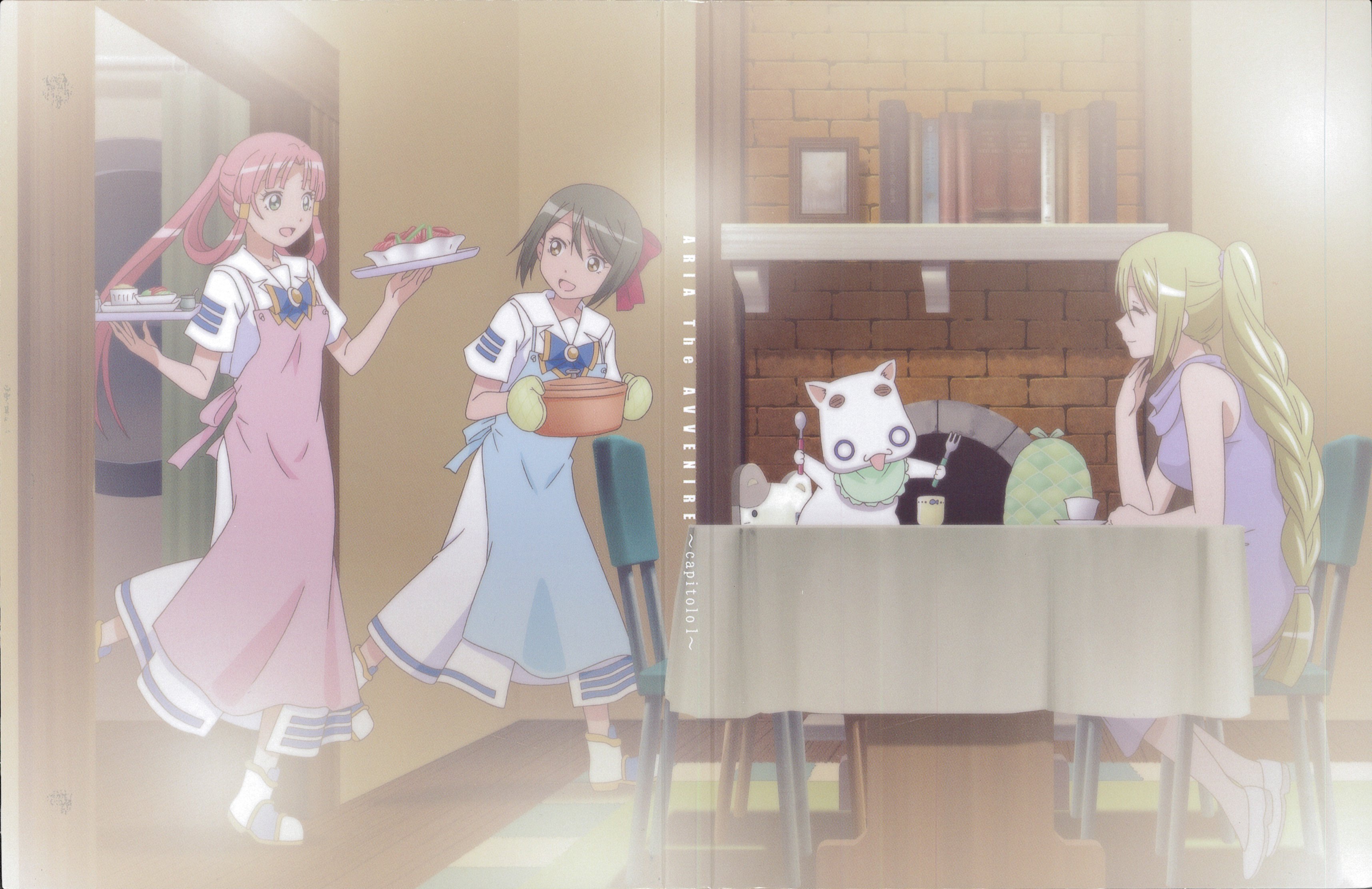 Description: A group of girls standing around a table with food on it and a cat sitting on the table in front of them.
