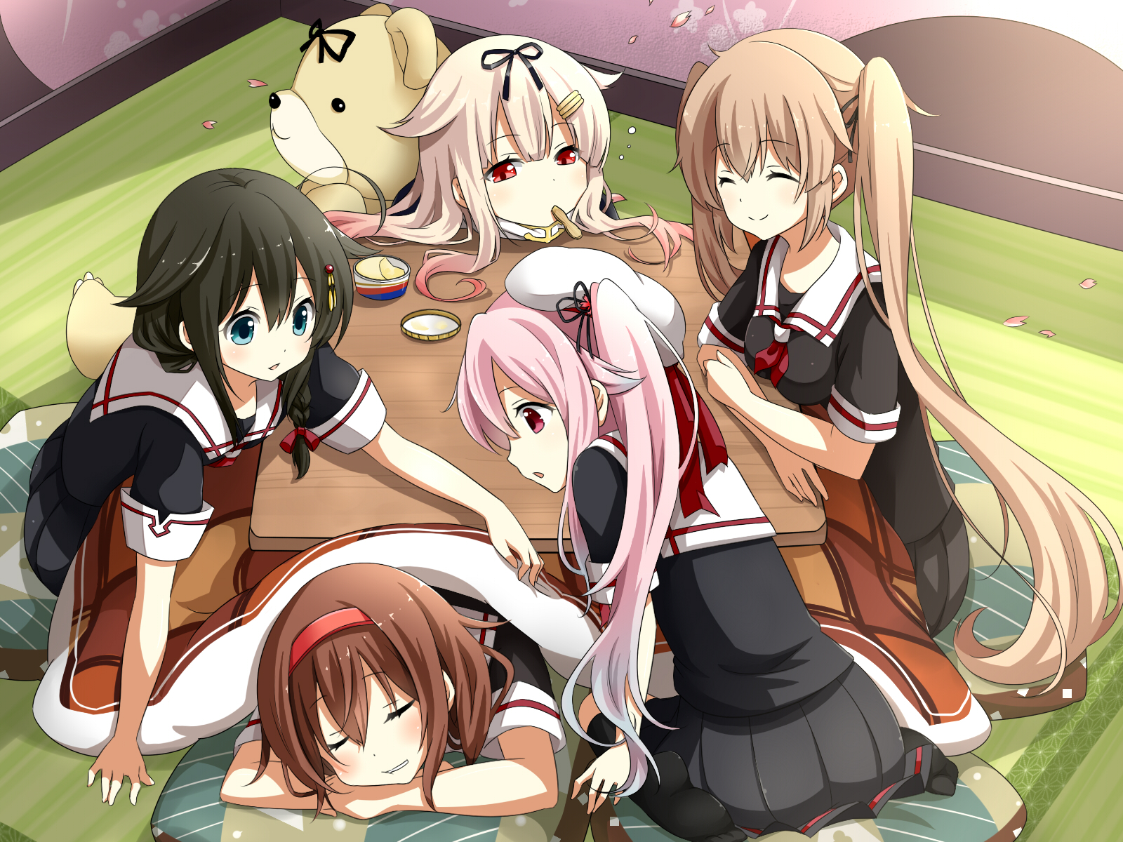Description: A group of girls sitting around a table with food on it and a stuffed animal in the background.