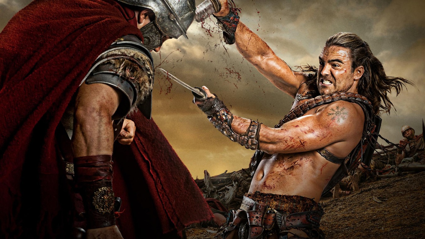 Description: A man in a gladia costume is holding a sword and a man in a helmet is holding a sword.