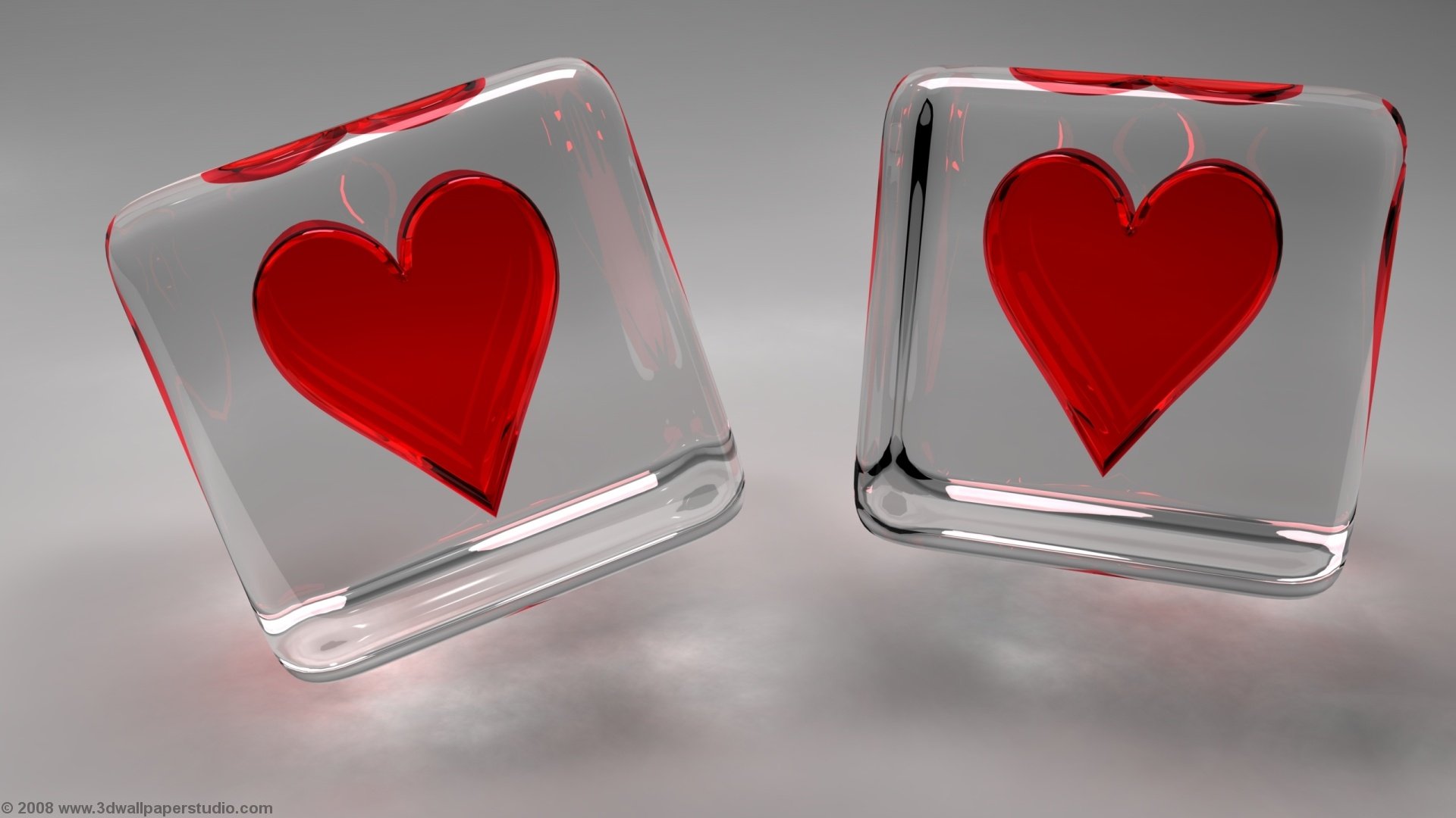 Description: A couple of glass blocks with a heart on them on a table top with a red ribbon on top.