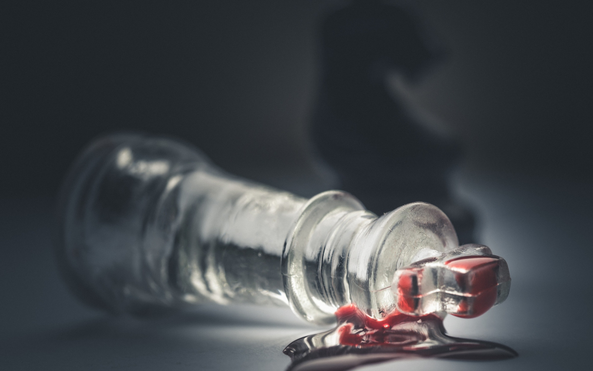 Description: A glass bottle with a red liquid spilling out of it's side and a black object in the background.