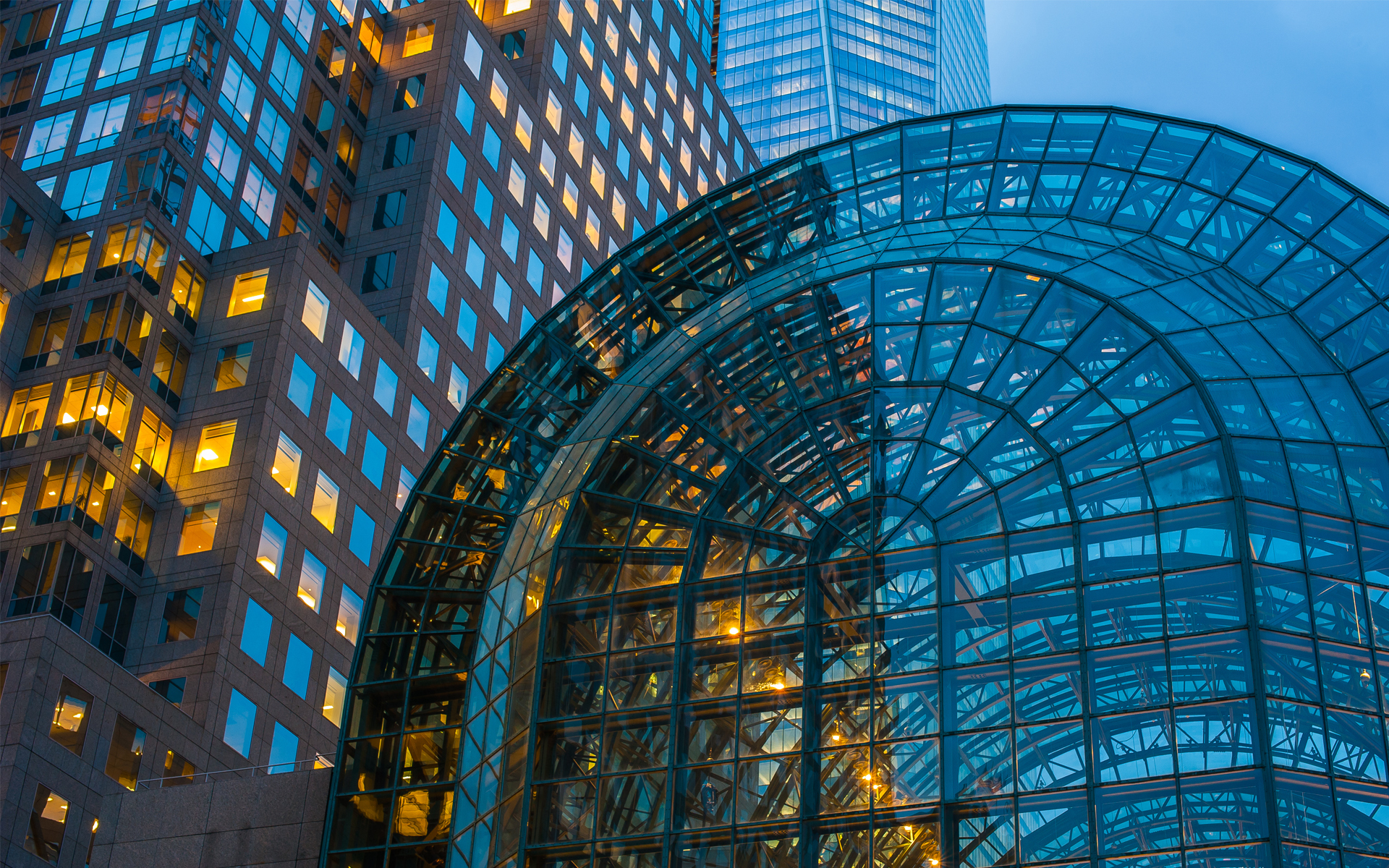 Description: A glass building with a clock on the front of it and a glass dome on the back of it.