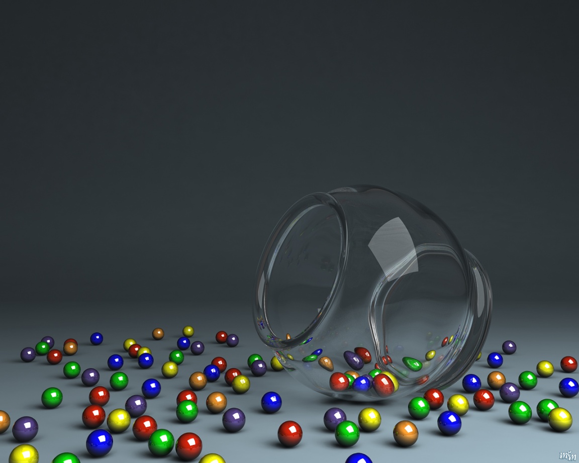 Description: A glass filled with colorful balls on a table next to a magnifying glass filled with colorful balls.
